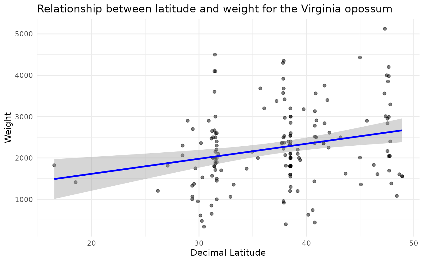 In this example we query Arctos for morphological data for Didelphis virginiana (the Virginia opossum) and use geographical coordinate data and weights to explore patterns of Bergmann’s rule.