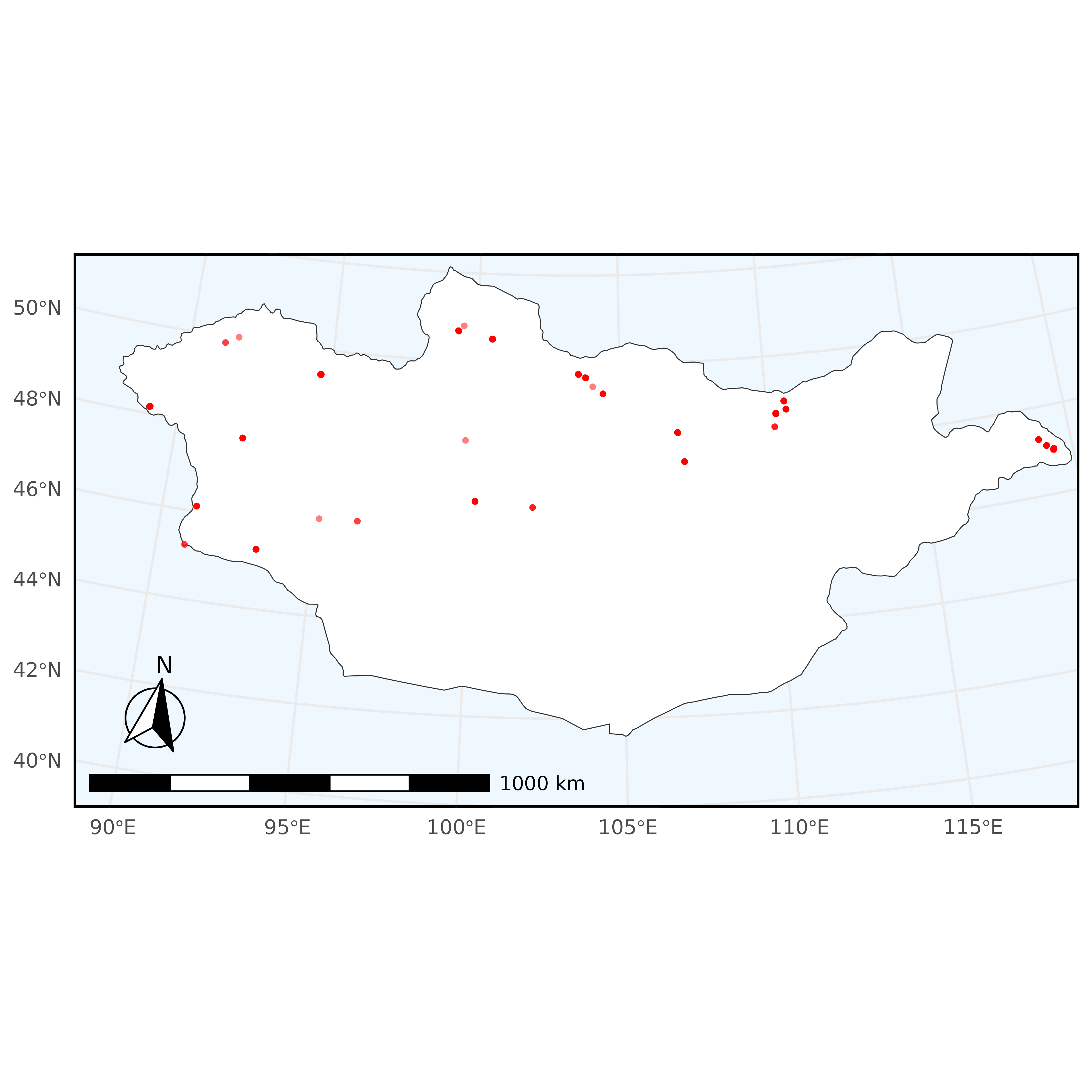 We can plot the spatial distribution of specimens with and without detected nematodes using the ggplot2 package. First, we can simply create a plot of the distribution of all specimens over Mongolia.