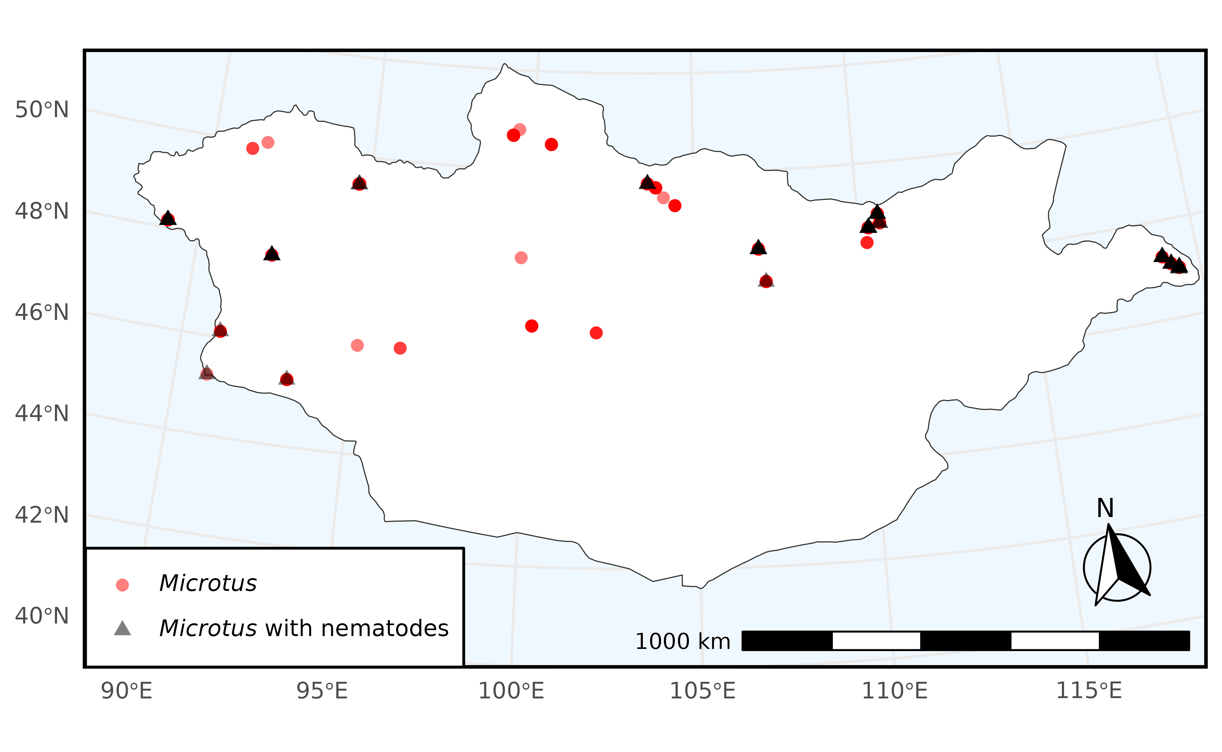 # Plot of Microtus sampled in Mongolia filtered by nematode detected/not detected