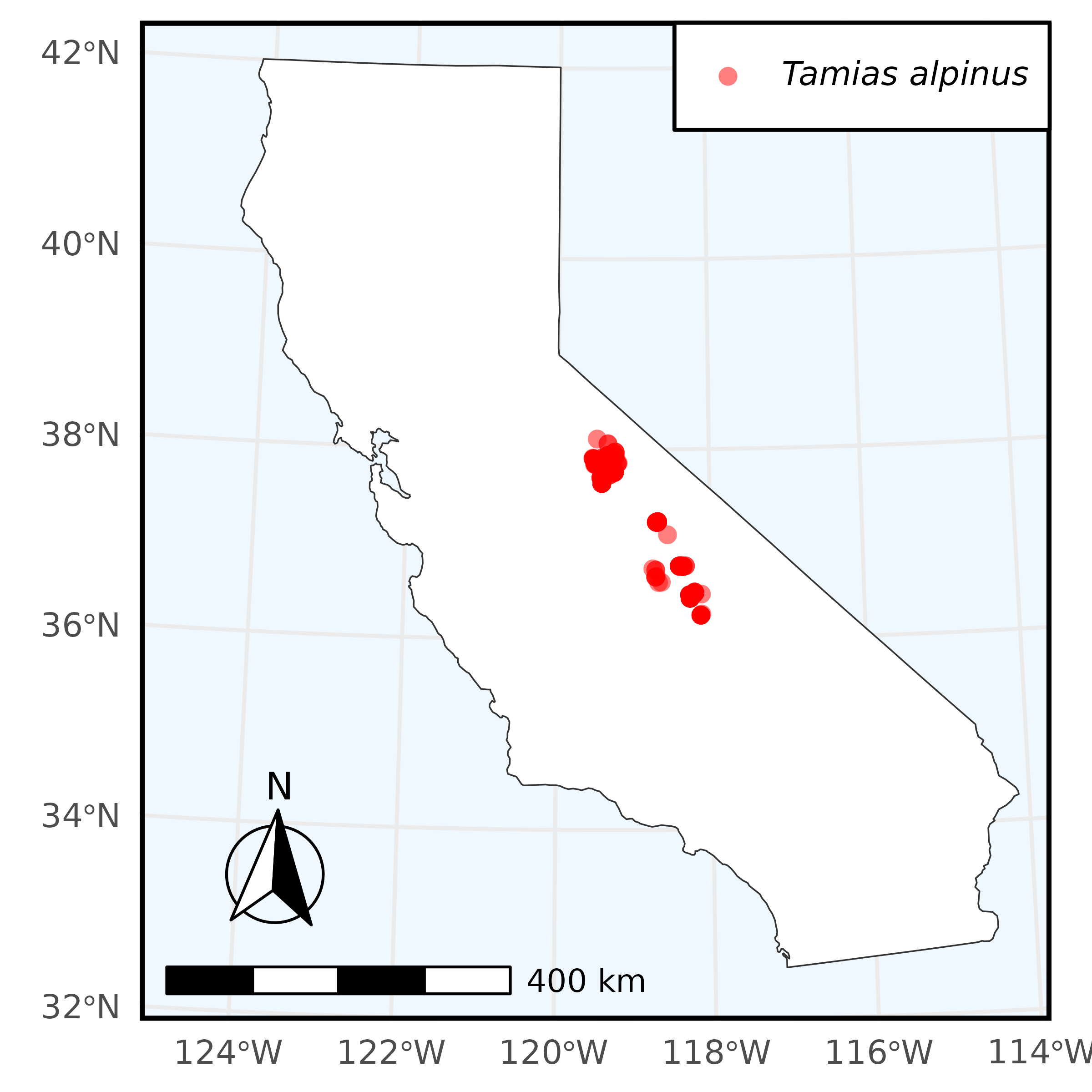 # Plot of Tamias alpinus sampled in California and currently stored in the